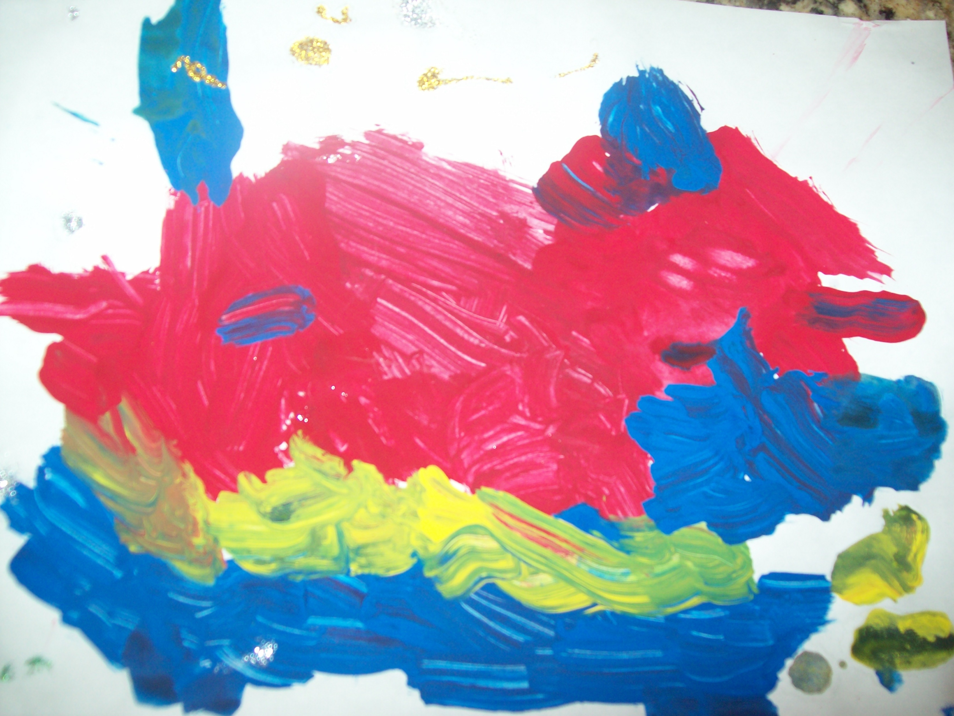 What was I thinking? Making snowy owls was my idea, not theirs; they want to create, not copy. I cobble together a somewhat rumpled snowy owl and let them do their own thing, which they entirely prefer anyway. They paint the cotton balls and glue them on paper. When they run out of cotton balls, they indulge in a few paintings.